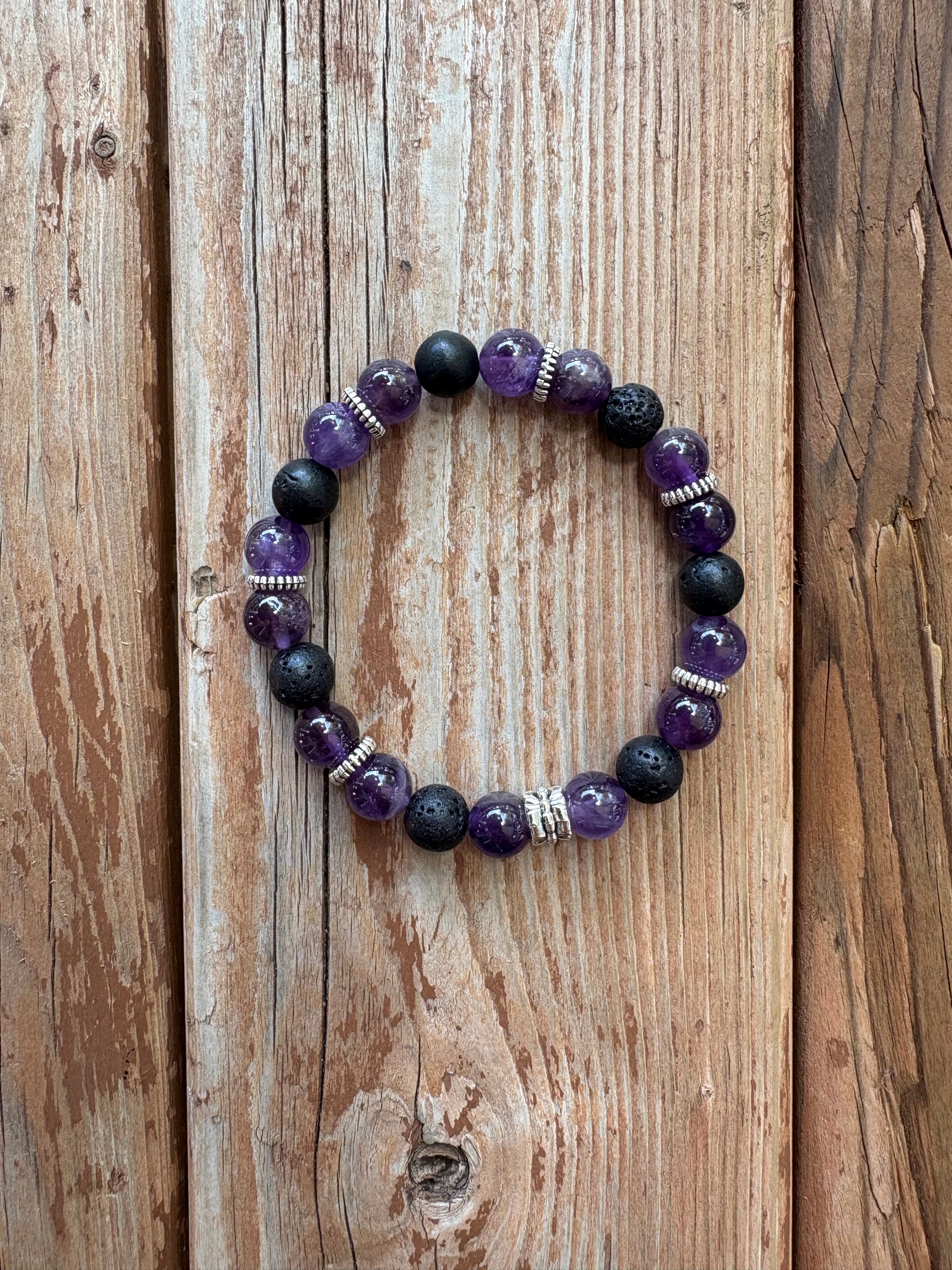 Ce bracelet est une alliance puissante entre la sagesse spirituelle et la force terrestre, grâce à l’association de deux pierres aux énergies complémentaires : l’améthyste et la pierre de lave noire.