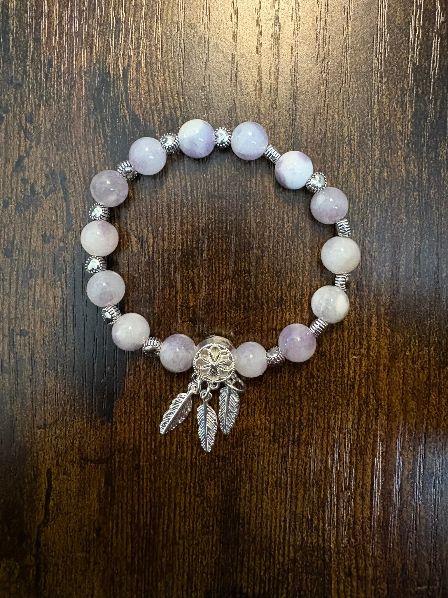 Laissez-vous envoûter par la magie de ce bracelet artisanal, composé de pierres de quartz blanc, symbole de pureté et de clarté, et de calcédoine violette, pierre de sérénité et d’harmonie intérieure. Au centre, un pendentif attrape-rêves vient compléter cette création, rappelant les traditions ancestrales qui protègent des mauvais songes et attirent les énergies positives. Ce bijou est bien plus qu’un accessoire : c’est une invitation à la paix intérieure, à la connexion spirituelle et à l’élégance naturelle. Portez-le comme un talisman, un compagnon de tous les jours, ou offrez-le à une âme chère en quête de douceur et de lumière.